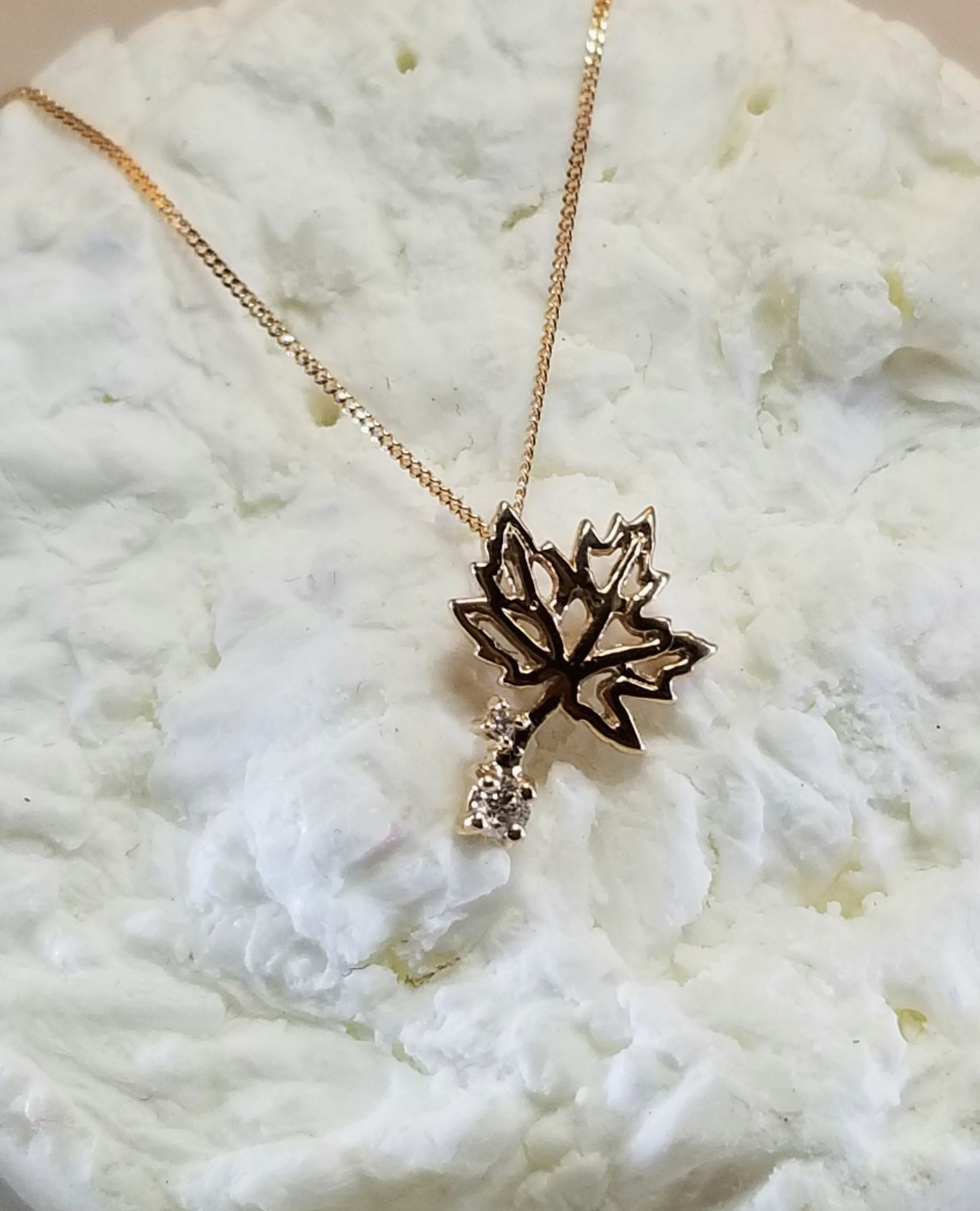 This Canadian diamond pendant has 2 diamonds nestled in the stem of our iconic maple leaf. The perfect gift for any lady!