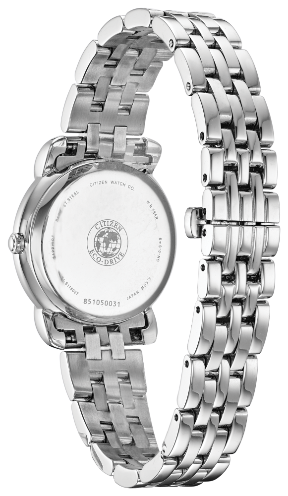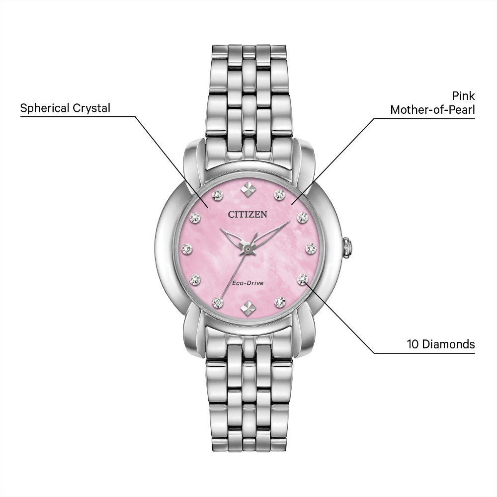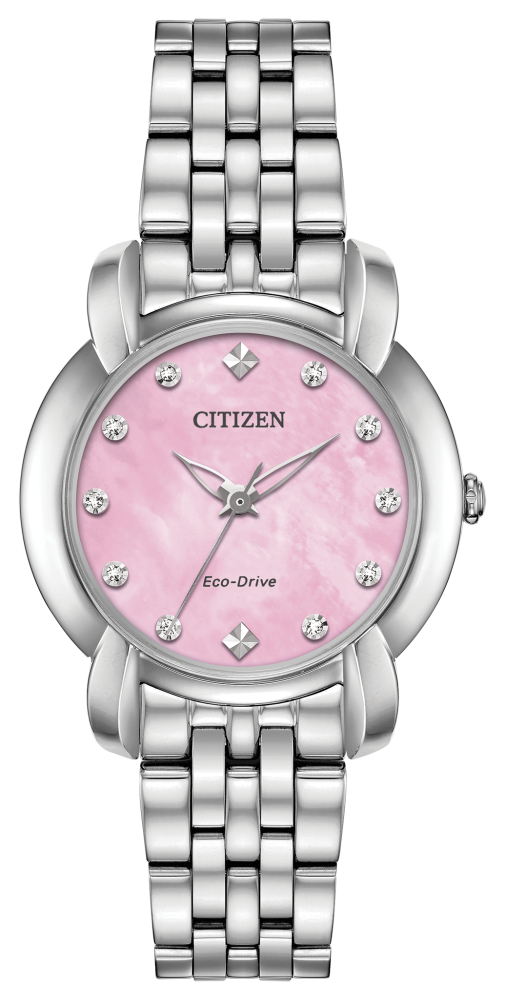 Reminiscent of the classic bow styling, the Jolie timepiece brings a fresh shine to your style. Featured with brilliant diamonds on the dial, this watch is a perfect match for your little black dress. Shown here in stainless steel with a light pink Mother-of-Pearl dial. Featuring our Eco-Drive technology – powered by light, any light. Never needs a battery.