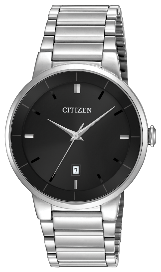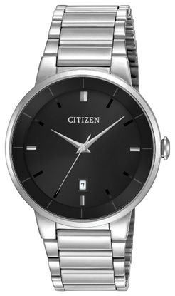 This CITIZEN® Quartz timepiece features a stainless steel case and bracelet with a black dial and date. Very classic ...