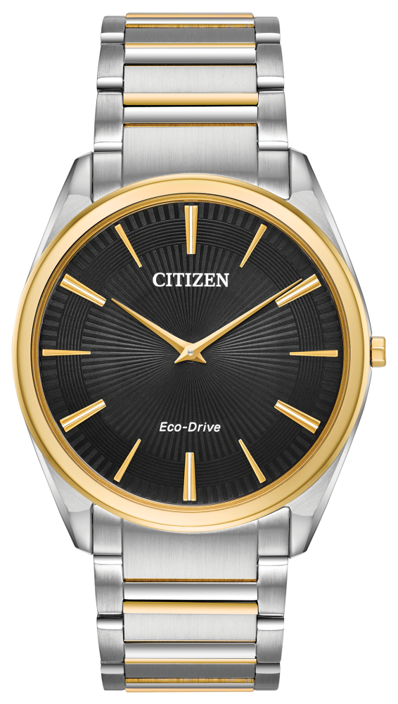 Sleek, elegant, and ultra thin - at just 4.71mm thin, timepieces from CITIZEN®'s Stiletto collection are among the brand's thinnest light-powered watches. Shown in a two-tone stainless steel case and bracelet with a black dial.